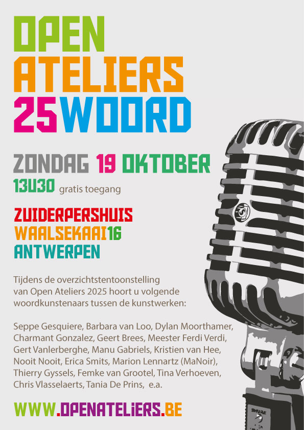 Op zondag 19 oktober vanaf 13u30 u brengen enkele woordkunstenaars eigen werk tussen de kunstwerken. Gevolgd door een OPEN MIC voor wie zich geroepen voelt!